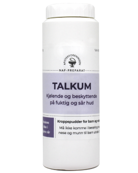 Talkum NAF er et kroppspudder for barn og voksne. Talkum virker kjølende og beskyttende på fuktig og sår hud.